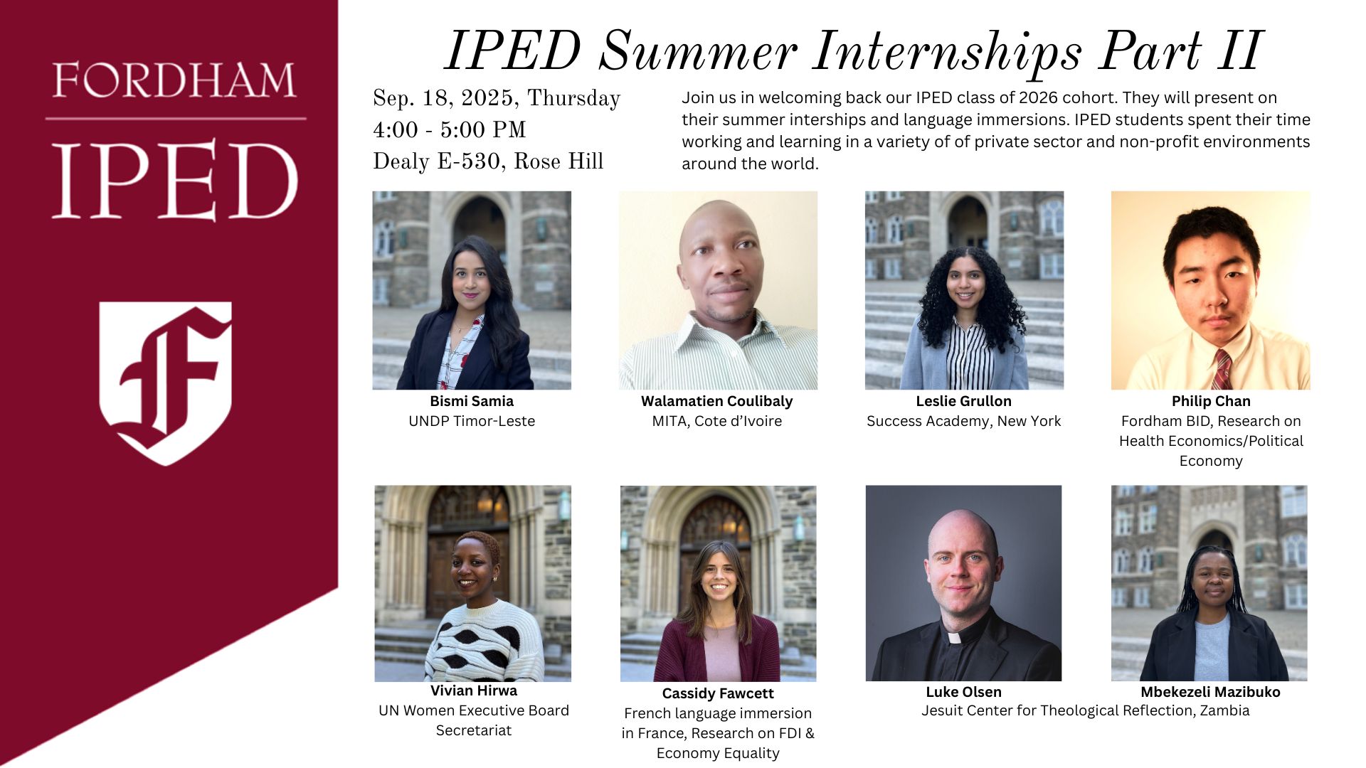 Join us in welcoming back our IPED class of 2026 cohort. They will present on their summer interships and language immersions. IPED students spent their time working and learning in a variety of private sector and non-profit environments around the world.