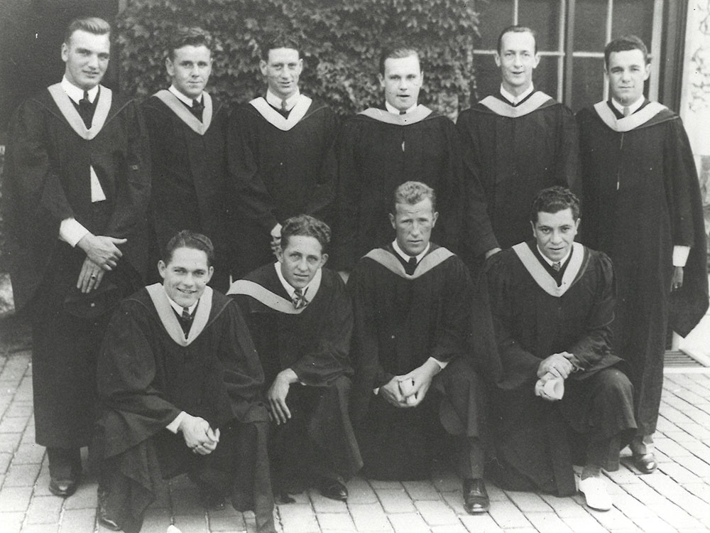 On his Fordham graduation day, Lombardi (bottom, right) posed with his fellow football lettermen in the Class of 1937.