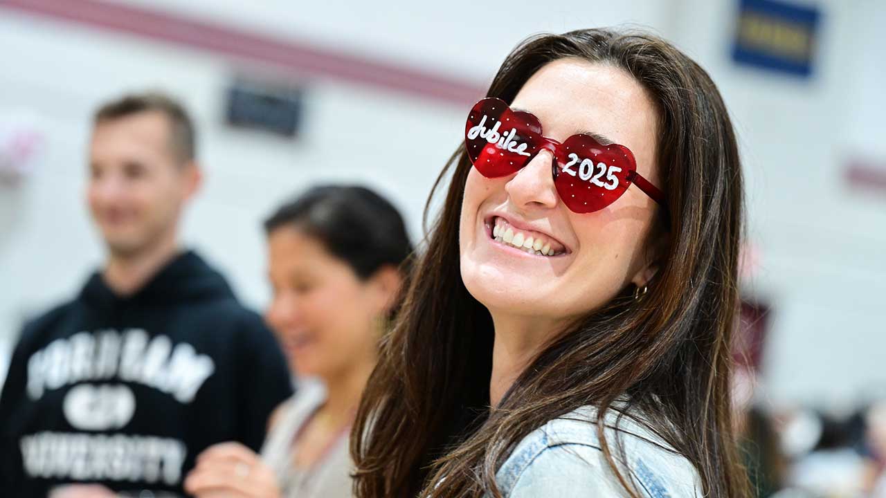 For Jubilee, alumni viewed campus through pairs of maroon-colored glasses. Sisters Colleen Gordon, FCRH ’16, and Kathleen Passantino, GABELLI ’11, ’12, enjoyed some of the family-friendly activities on offer inside the Lombardi Fieldhouse. (Read more about the sisters, their husbands, and other Rams who made friends for life during their time at Fordham.)Revelers partied on the plaza at Block Party at Lincoln Center, which drew more than 600 graduates from the schools based at the Manhattan campus.A group of friends posed with their caricatures. Having one drawn during the picnic is a fan-favorite Jubilee tradition.Friends gathered to dance, eat, drink, and catch up.Gary King, GSS ’12, Saufia Pierre, and Rose McCauley, GSS ’12, were all smiles.The Class of 1975 officially joined the Golden Rams Society on May 30 at a soiree for alumni celebrating 50 or more years since their Fordham graduation. President Tetlow toasted the attendees, who enjoyed dancing and live music following dinner. Two attendees took in the sunset over the Hudson River from the plaza lawn.Lori Takooshian Dondiego, FCLC ’05, Helen Ledwith, FCLC ’00, and Patrick Tighe, FCLC ’00, presented President Tania Tetlow with a reunion gift of more than $2.1 million, collected from alumni over the past five years. The Jubilee reunion gift total, also collected over the past five years, was $77.5.Alumni hit the dance floor under a twinkle-lit tent for the annual Jubilee Gala.Jason Yuen, GABELLI ’12, and guest Wen Li enjoyed the last moments of daylight.Members of the Class of 2005 celebrated their 20-year reunion milestone at the Jubilee Gala.Evening set in over Western Manhattan.As night fell, attendees got the dance party going.It was a great day to be a Ram!Block Party attendees mingled throughout the plaza level. The event drew graduates from 53 unique class years.