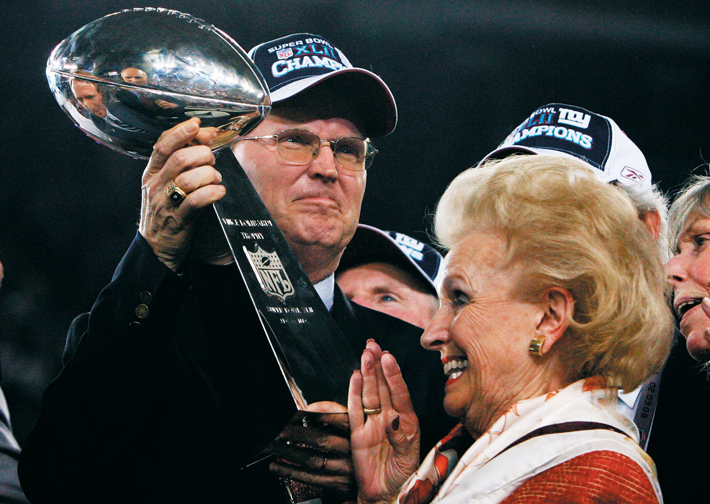 John Mara proudly displays the Lombardi Trophy, as his mother, Ann Mara, celebrates on the field at University of Phoenix Stadium. Harry How/Getty Images
