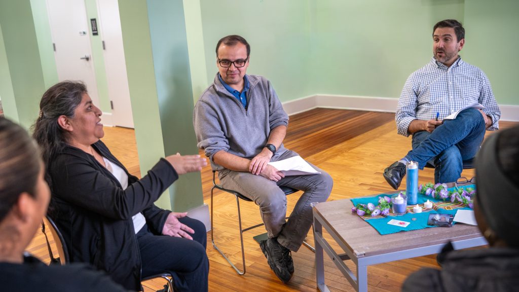 Each Jesuit is connected with a single nonprofit for their three years in the program. The length of their commitment helps them develop expertise and foster camaraderie. Alvaro Pacheco and Carlos Martinez-Vela lead a storytelling class at Belmont Catholic Community Center, for example, in collaboration with Grupo de Mujeres Latinas. The aim is to help build bridges of understanding.
