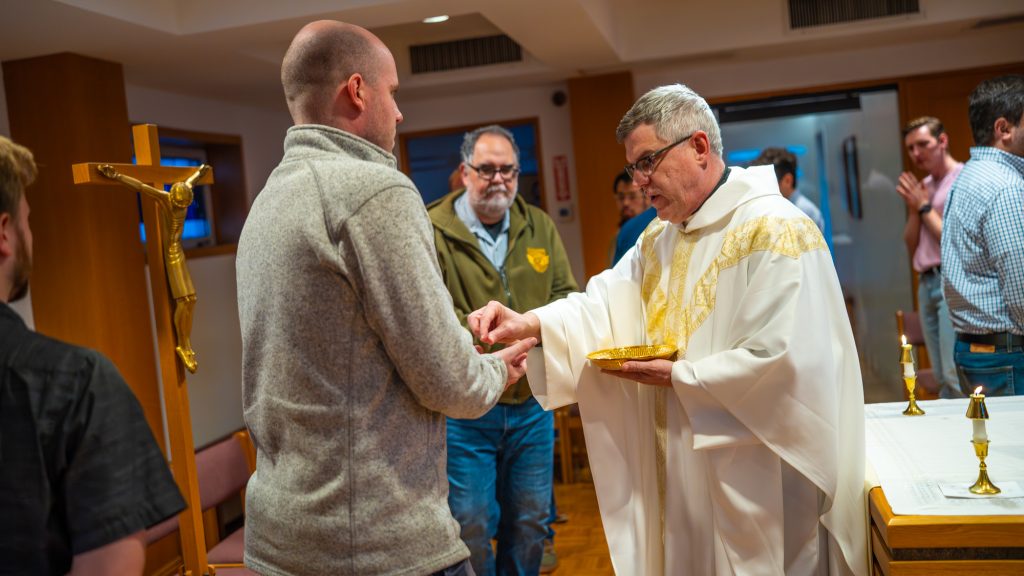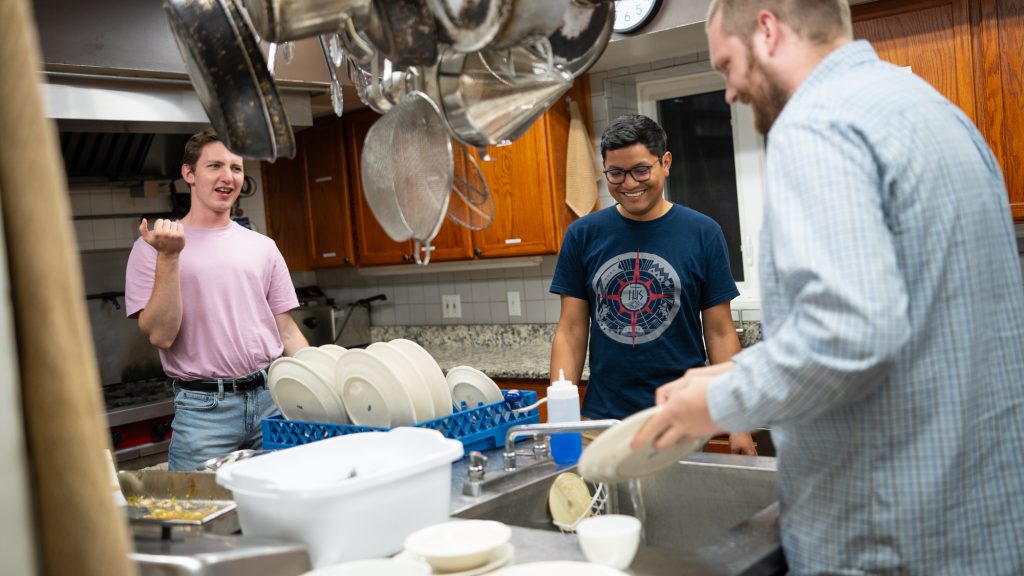 The rituals of daily living in Ciszek Hall keep the scholastics and brothers grounded. They celebrate Mass every evening before sharing a meal. Household duties are shared, too, as are games and movie nights to unwind. But most often, the men retreat to their rooms for private prayer and long stretches of studying the finer points of Aristotle and Aquinas.