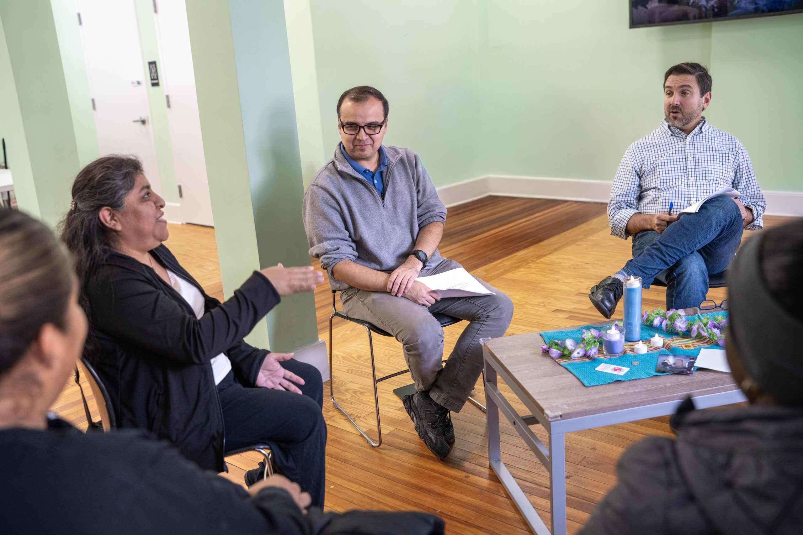 Each Jesuit is connected with a single nonprofit for their three years in the program. The length of their commitment helps them develop expertise and foster camaraderie. Alvaro Pacheco and Carlos Martinez-Vela lead a storytelling class at Belmont Catholic Community Center, for example, in collaboration with Grupo de Mujeres Latinas. The aim is to help build bridges of understanding.