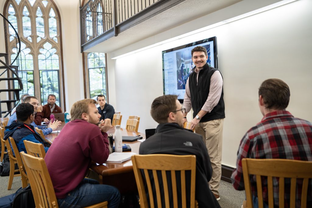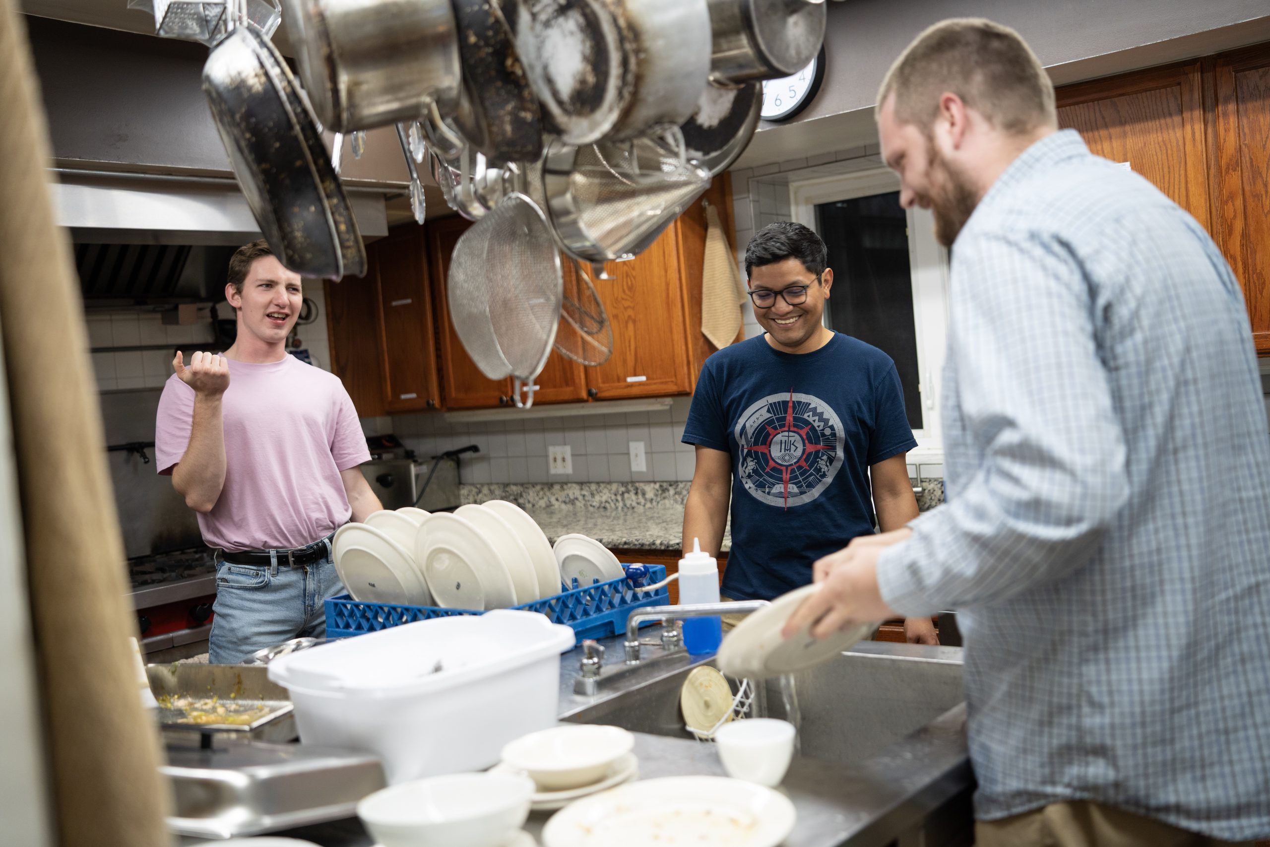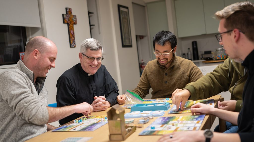 The rituals of daily living in Ciszek Hall keep the scholastics and brothers grounded. They celebrate Mass every evening before sharing a meal. Household duties are shared, too, as are games and movie nights to unwind. But most often, the men retreat to their rooms for private prayer and long stretches of studying the finer points of Aristotle and Aquinas.