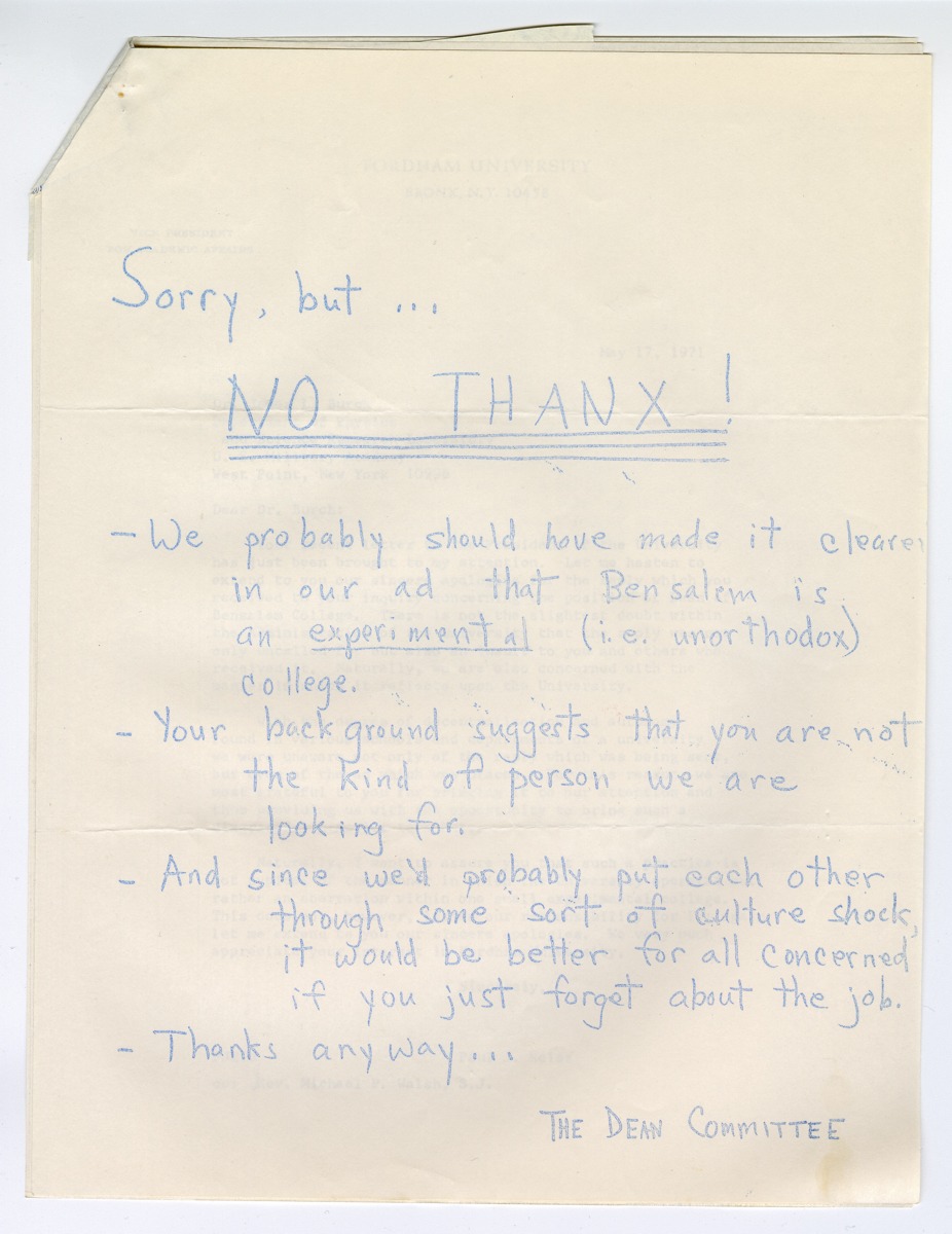 The experiment was short-lived. Students threw out the school’s only language requirement—Urdu—and tried to hire their own dean even though Fordham was not looking for one. (The rejection letter above offers a window into their interview process.) By 1971, a campus council voted to phase the school out.