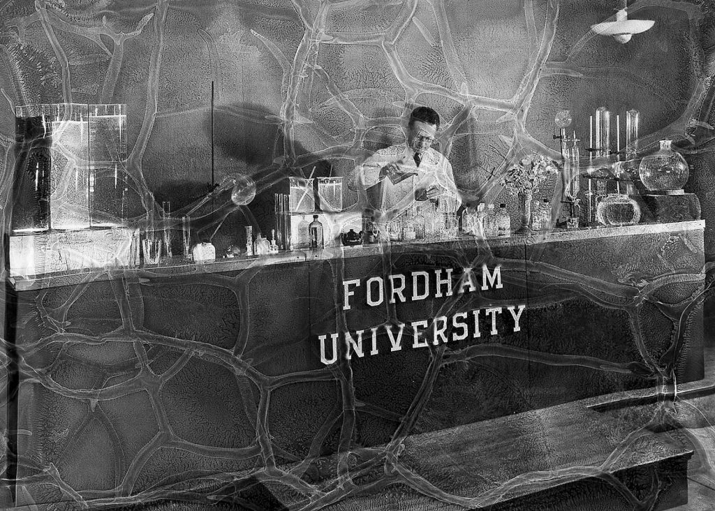 Fordham has been capturing campus beauty shots for its marketing materials at least as far back as the 1930s, when freelance photographer William Fox was hired to photograph the University, student life, and special events like commencement. Some of his negatives degraded over time, giving them a surreal quality that appealed to Apicella-Hitchcock. He chose 17 of Fox’s altered images for his 2014 exhibit to contrast the mysterious and beautiful flaws of the analog process with the perfection of the digital age. In the above image, “it appears that the Fordham professor conducting experiments has had their chemical process leak out of the lab and literally onto the film itself,” he said, “causing a practically psychedelic rupture and patterning to the photograph.”
