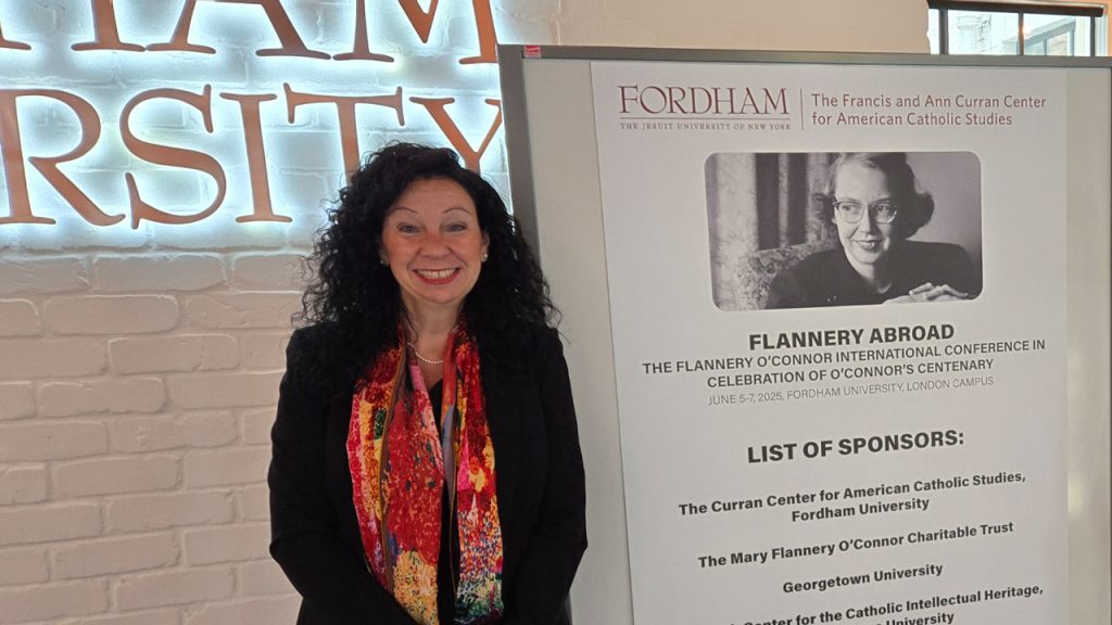 The late Southern author Flannery O’Connor journeyed in spirit to Fordham London this June for the fifth International Flannery O’Connor Conference. Titled Flannery Abroad, the conference honored the Catholic writer’s centenary and drew nearly 100 O’Connor scholars and aficionados from around the world to discuss her legacy and draw new insights from her writing, from Southern gothic short stories like “A Good Man Is Hard to Find” to her novel The Violent Bear It Away.