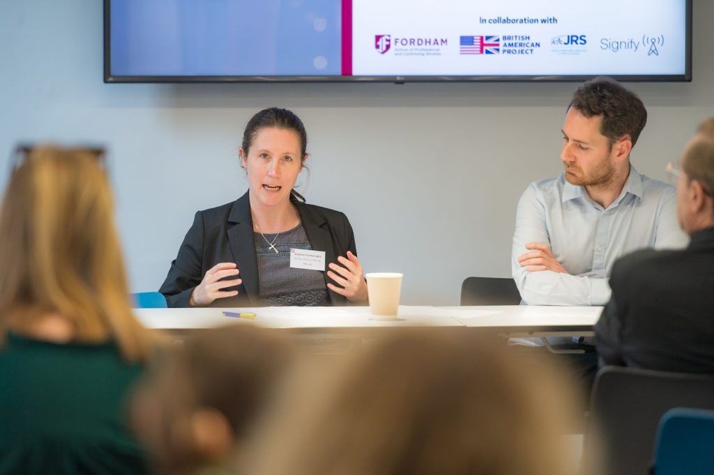 The event grew out of a conversation between Fordham London senior director Matthew Holland and Anthony Davidson, dean of Fordham’s School of Professional and Continuing Studies, whose College at 60 program is coming to Fordham London this May. Together with the symposium’s partners—Signify, a UK company that monitors online abuse, and the British American Project, a networking nonprofit—the theme emerged.