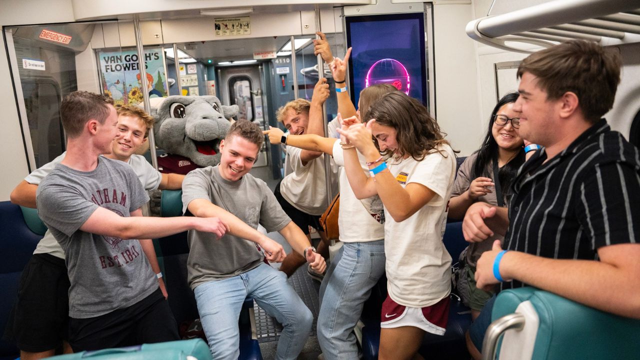 Students danced with Ramses on a MetroNorth train from the Rose Hill campus down to Lincoln Center as part of a new tradition that began this year. The train was reserved exclusively for Fordham students for the occasion.